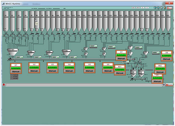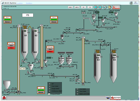 The core of our control systems is a powerful PLC with a SCADA system, mainly based on Siemens operating environment (SIMATIC S7, WINCC TIA PORTAL), including several security interlocks and allowing process-based visualisation, web-based access, recipe management and production data analysis.