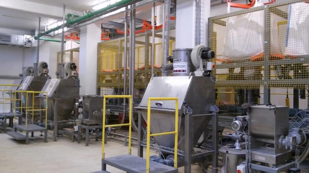 Big bags and bags loader and unloader, containers in direct connection with the production lines.