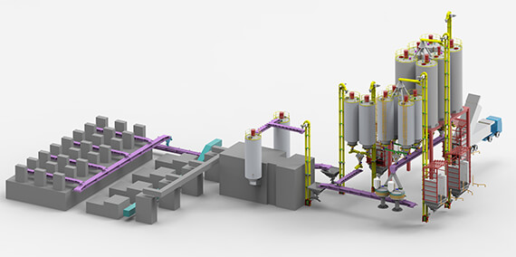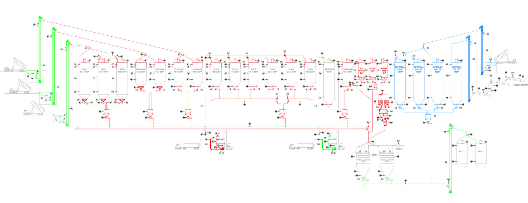 Batch House is a crucial part of a glass manufacturing site, since high quality glass production requires a high-quality batch, undoubtedly. An effective batch plant, supplying high quality mixed raw materials is considered as the starting point for the whole Plant performance’s increase. Manufacturing High Quality Glass requires an exact and reproducible batch composition. Each plant is uniquely planned, designed and implemented for each customer.