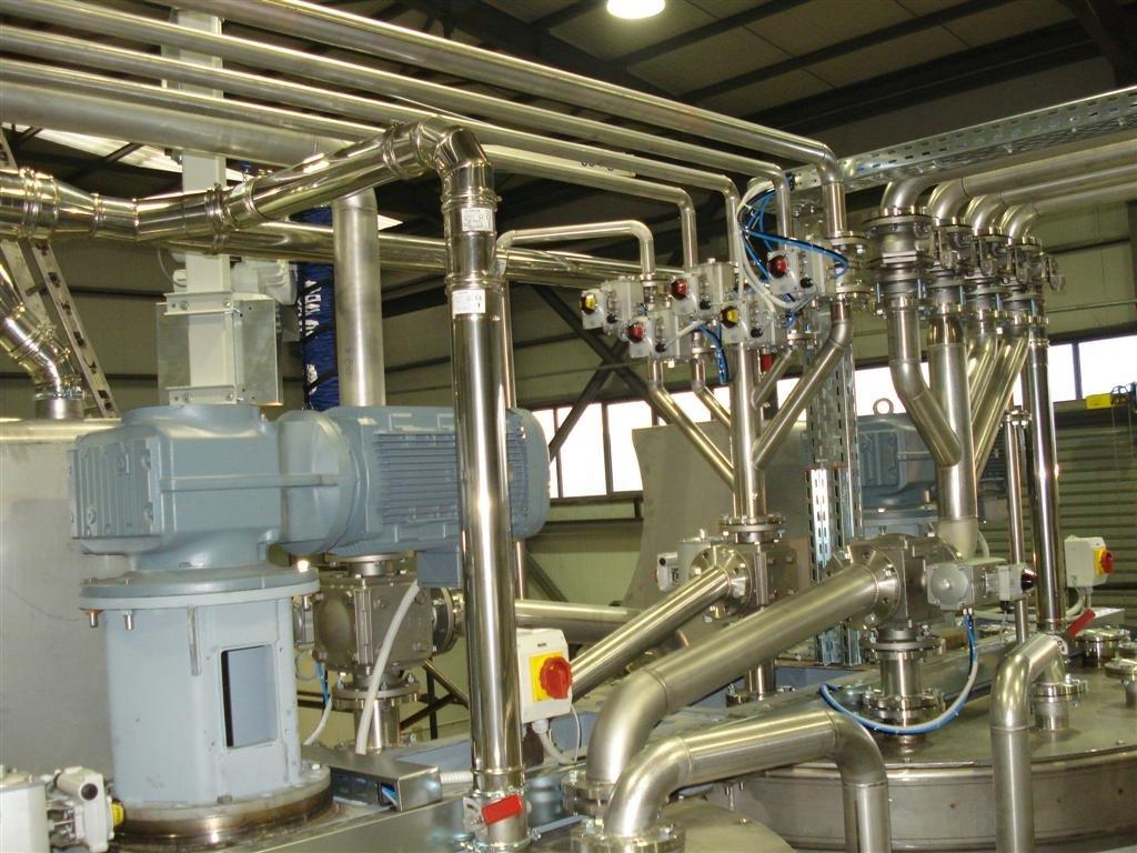 During second stage, we execute the recipes in complete automated way, using liquid raw materials stored in the corresponding tanks, minor liquid ingredients stored in IBCs, main powder ingredients from big bags, micro ingredients in powder form from sacks splitters on top of the mixing vessels as well as micro ingredients in liquid form being fed from drums on platform scales, according to the execution steps of each recipe.