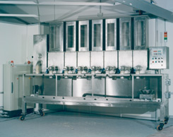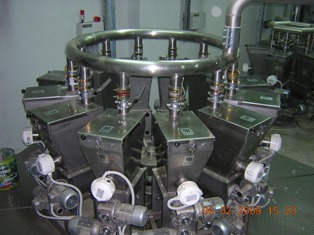 Semi automatic micro dosing system in linear orientation. The machine's operator collects the batch bowl (see bottom right) with all the micro ingredients of the recipe.