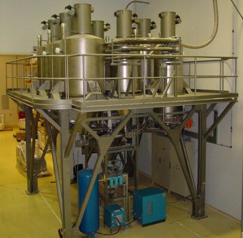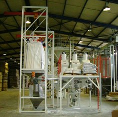 This combination of different systems includes big bag unloaders and sack splitters. Actually, it includes 2 systems for big bag unloading and one of them has been equipped with a manual sack splitter. Finally, the system includes also 3 separate sack splitters on a metallic scaffold with dedusting system. All 5 materials dosed in a weighing hopper on the ground level through screw conveyors.