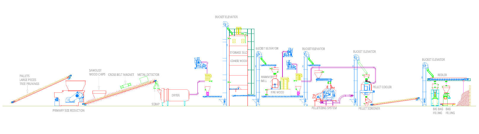 The typical production of wood pellets, starts with the receipt of raw matterials to be used (wood of various types, pallets, sawdust, wood leftovers etc.) which go through a grinder to reduce their size.