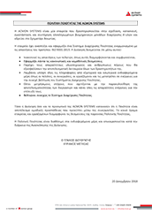 Στα πλαίσια αυτά η Αcmon Systems εφαρμόζει το σύστημα διασφάλισης ποιότητας EN ISO 9001:2015 κατά το οποίο είναι πιστοποιημένη από την TUV Αυστρίας και έχει υιοθετήσει σύγχρονη διαδικασία εσωτερικού ελέγχου σύμφωνα με τα διεθνή πρότυπα εταιρικής διακυβέρνησης.